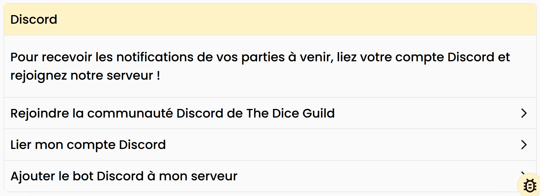 Vous avez besoin d'un lien avec le bot Discord. Pour ce faire vous avez 2 possibilités : Rejoindre la communauté Discord de The Dice Guild ou Ajouter le bot Discord à votre serveur.