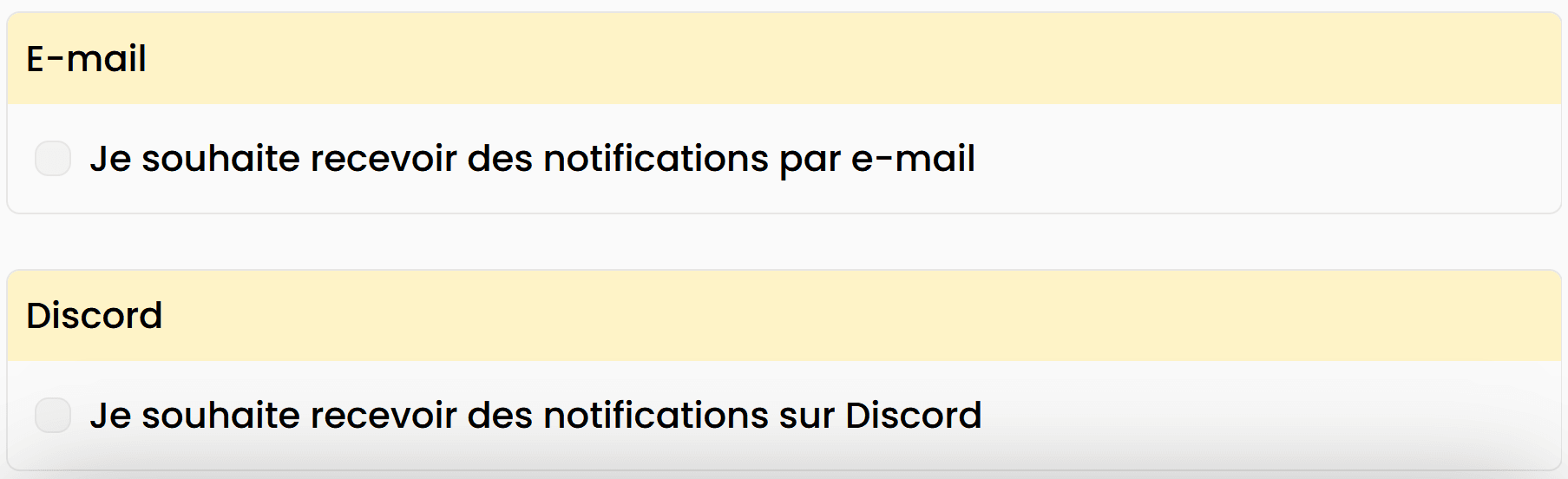 Pour chaque catégorie de notification, vous pouvez choisir si vous souhaitez la recevoir par email et/ou sur Discord.